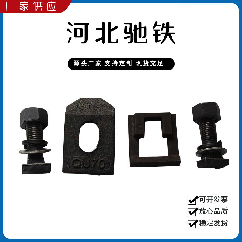 主要產(chǎn)品:鐵路配件、行車(chē)配件、工礦配件、魚(yú)尾板、道釘、壓軌器、軌道壓板、軌距拉桿、護(hù)軌扣板、T型螺栓、魚(yú)尾螺栓、彈條、軌距擋板